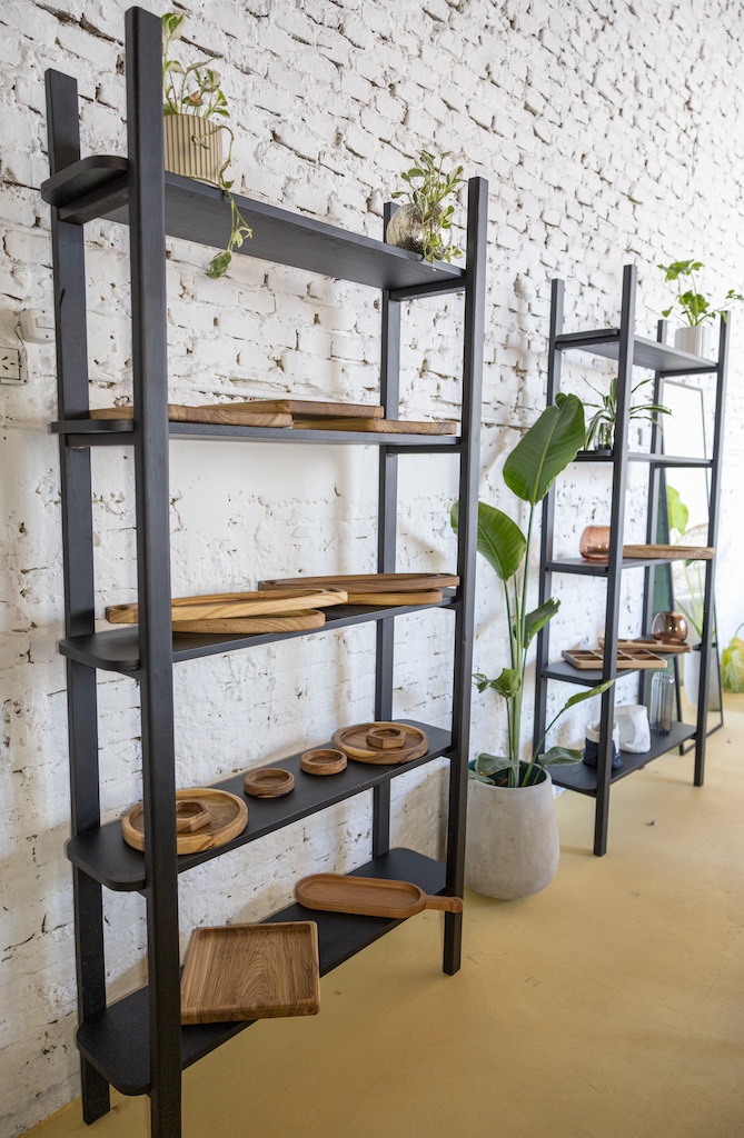 Material: Madera Kiri. Madera maciza para la estructura y enchapada para los estantes.