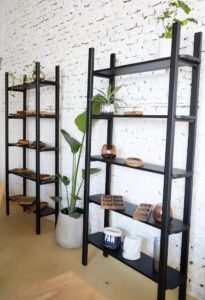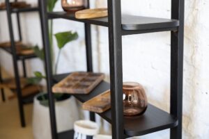 Realizada en madera laqueada negra, combina líneas rectas con proporciones amplias, ideal para decorar, exhibir libros o almacenar objetos de diseño.
