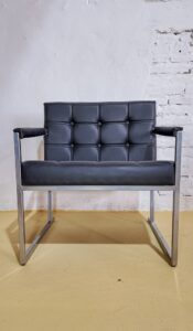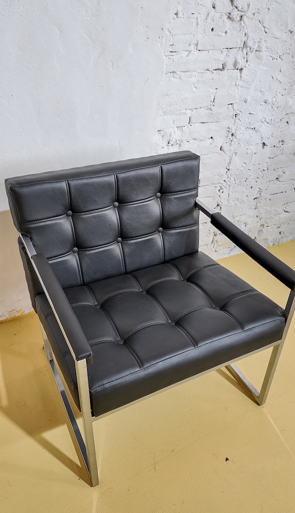 Su estructura cromada y asiento forrado con ecocuero lo vuelven una pieza versátil, ideal para ambientes modernos o corporativos.